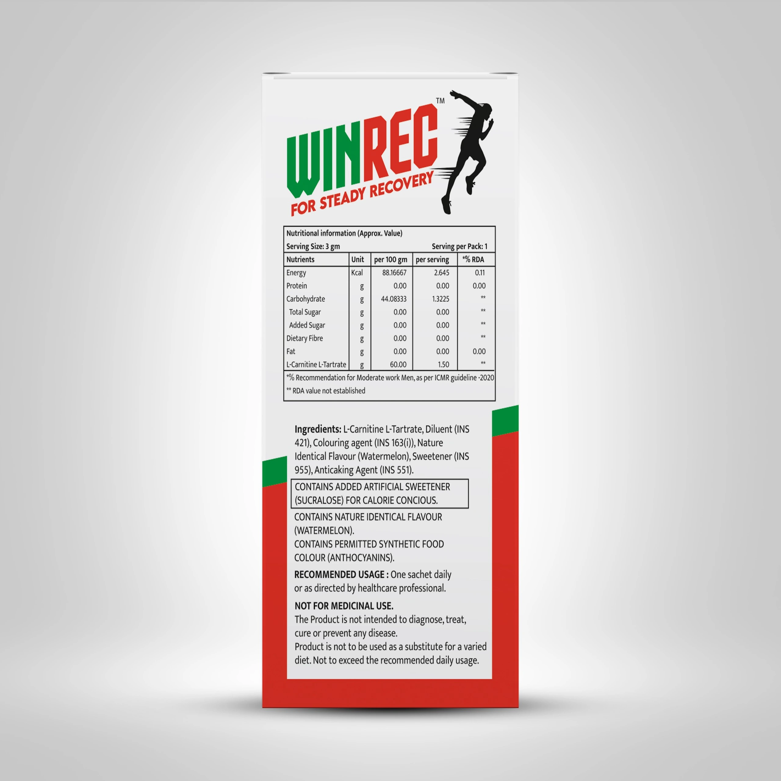 Ingredients L-Carnitine L-Tartrate, Diluent (INS 421), Colouring Agent (INS 163(i)), Nature Identical Flavor (Watermelon), Sweetener (INS 955), Anticaking Agent (INS 551).